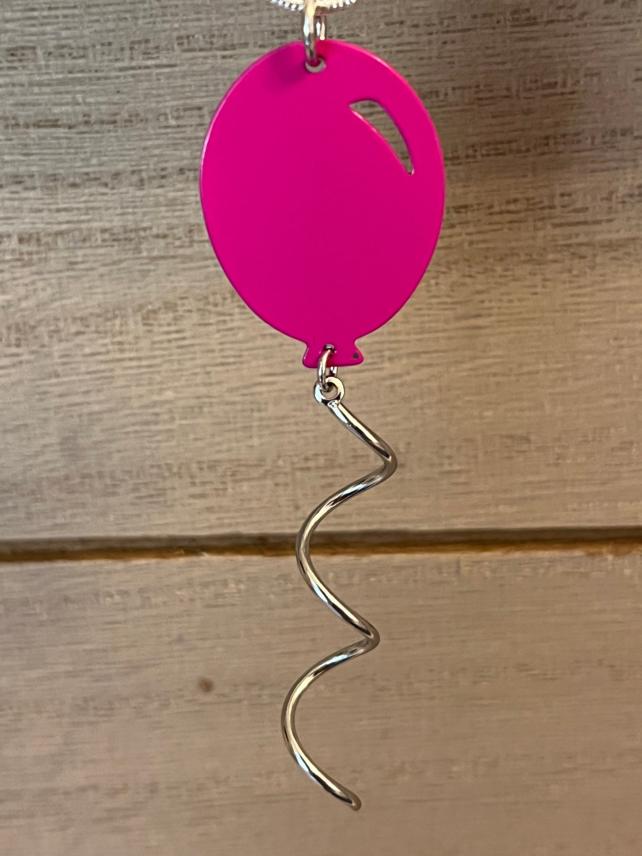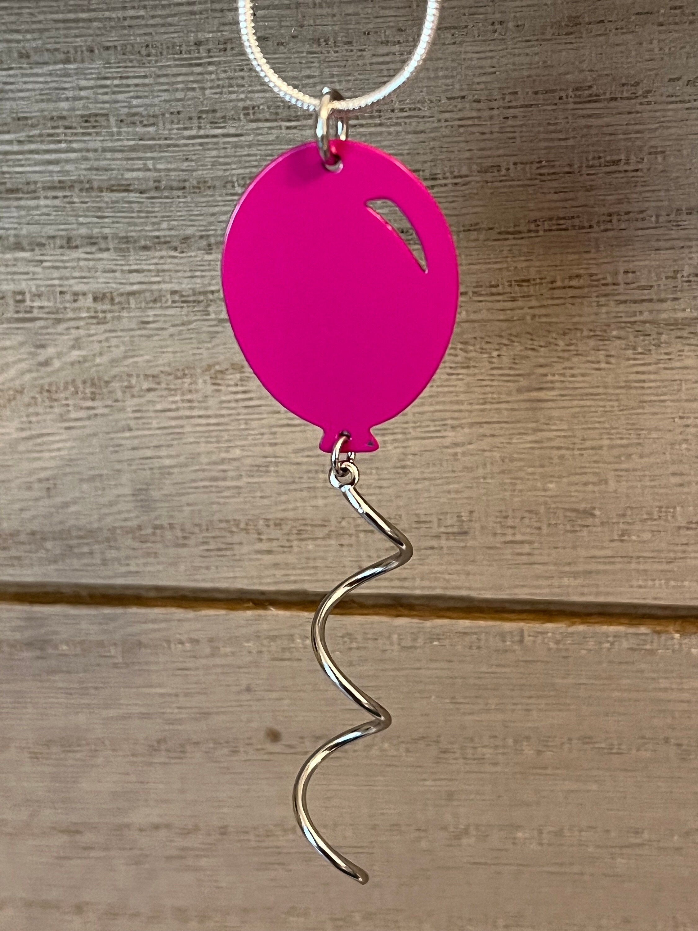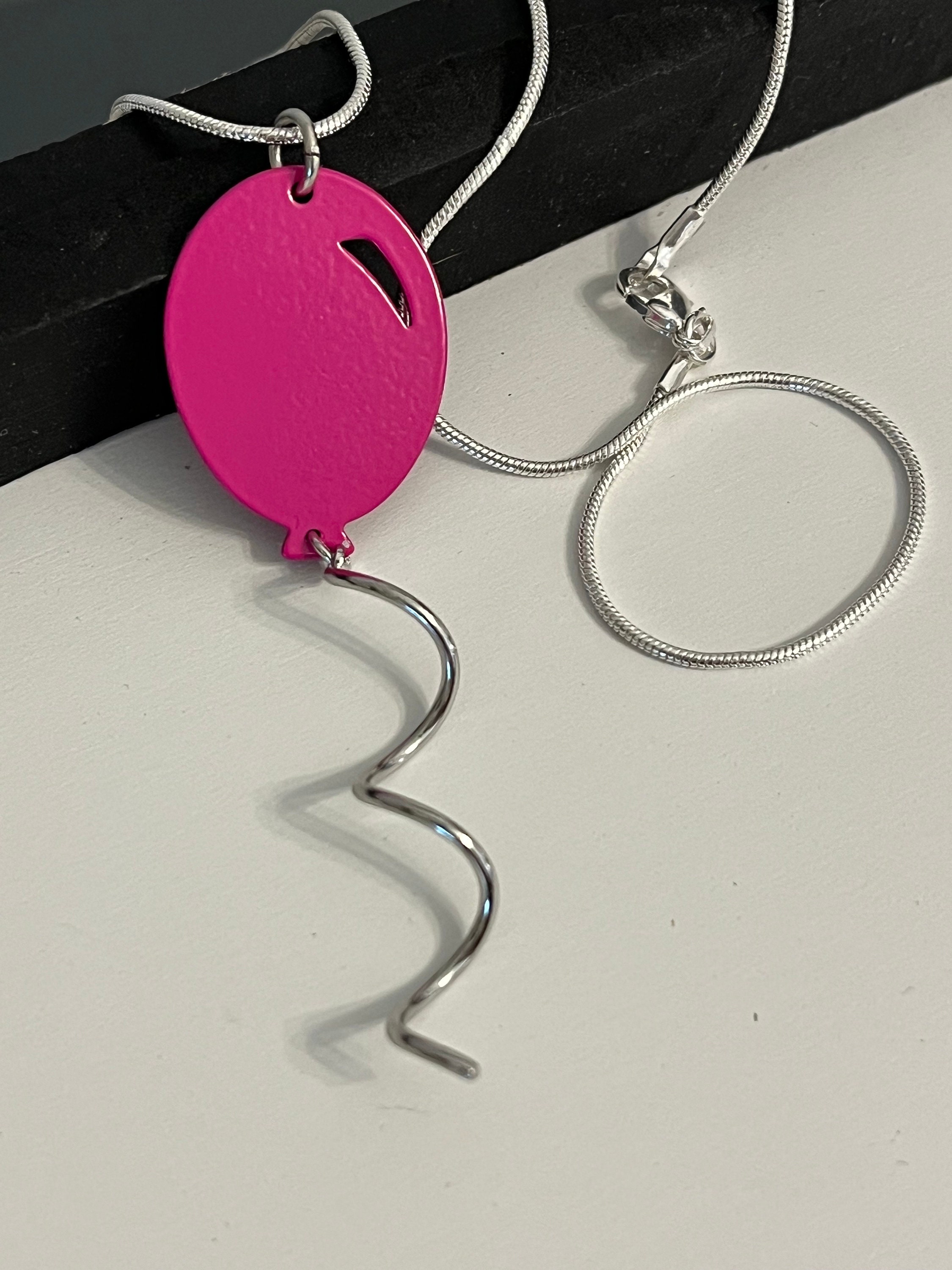 Balloon necklace is metal and measures almost 4 inches including the metal coil string. Comes on a sterling silver plated snake chain in the length of your choice. A sizing chart is included in pictures for reference.